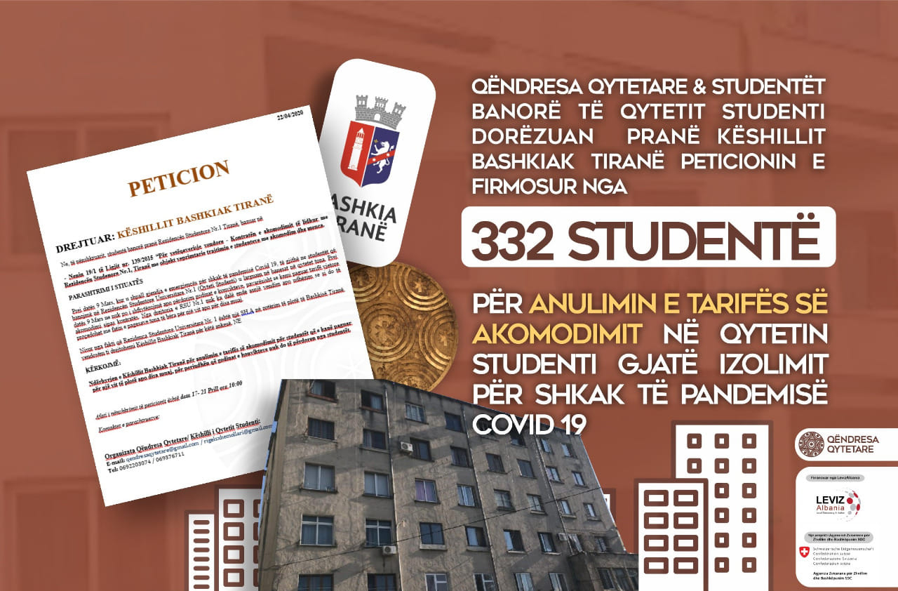 The Civic Resistance submitted to the Tirana Municipal Council a petition with 332 signatures from students living in the dormitories, calling for the cancelation of the dormitory fee and/or of money refund, an initiative that was supported by the Ombudsman of Albania. This initiative was successful as the Student City Directorate informed students on the start of fee cancelation procedure.